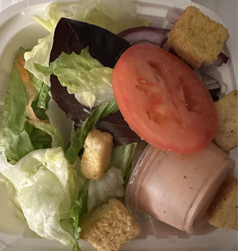 A bed of mixed greens topped with crab, with cucumber, sweet bell pepper, tomato and boiled egg. Served with a side of Thousand island dressing.